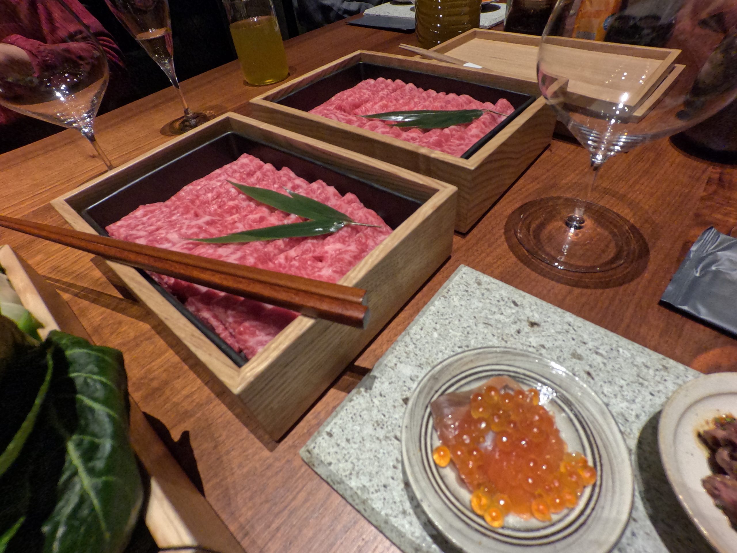 お食事の希望時間30分ほど前になるとピンポーンとインターホンが鳴り、スタッフの方が来て夕食の準備をしていただけます。夕食はこちらのダイニングテーブルでいただきます。今回の夕食は栃木牛しゃぶしゃぶ。12000円(税別)となります。食事に関してはもう少し低価格のお食事もありますし、もっと高額のお食事もあります。食事のメニュー料金に関してはリゾートトラスト、東急ハーヴェストなどの会員制ホテルと価格帯はほぼ同じとなります。